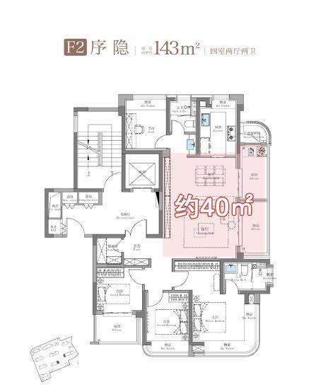 建面约143㎡还有一个侧厅户型,如果将客餐厅和双阳台打通之后,业主将获得一个约40㎡的起居空间!