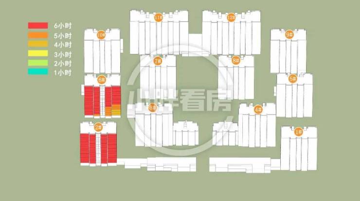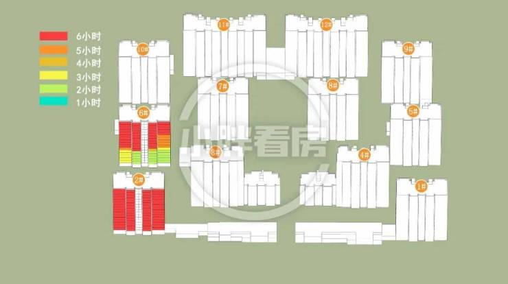 冬季:2#采光优异几乎不存在遮挡。6#中低层受遮挡。就具体遮挡时间而言,6#除傍晚外其余时间段均受遮挡。