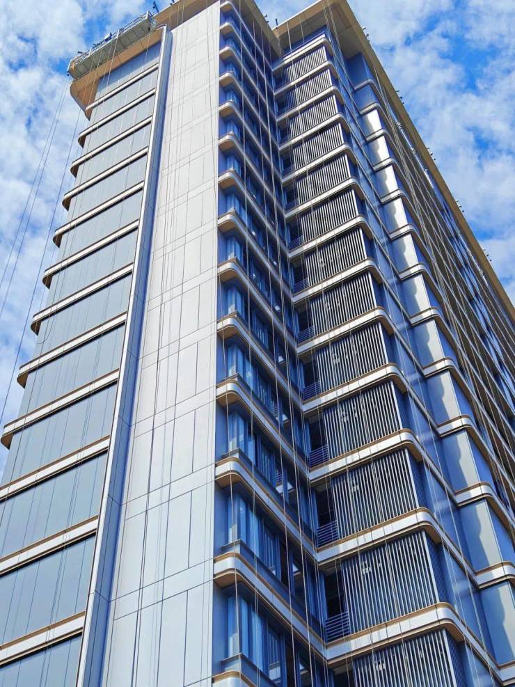 项目外立面采用三玻两腔双LOW-E系统化外窗与精致的铝板细节相结合,融合金属装饰与玻璃镜面的材质美感。