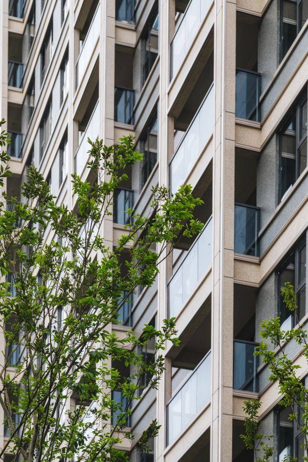 外立面整体形制优雅端正,时尚轻盈,简约有力,横向和竖向金属线条搭配。以简洁现代的线条表达立面感,加上对称的美学,使得建筑整体有着十足的现代感。同时,更大的窗墙比,让每一户的采光都能保持更佳。