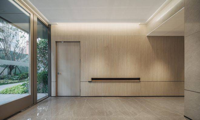 另外,项目还在卫生间台盆柜内侧设置了壁龛,放置抽纸、书籍等物品,增加实用性。入户玄关更是设计了大量的收纳空间。底部架空,可以用来摆放鞋子,并设置有嵌入式灯带,整体的氛围感拉满。并且为了方便业主后续在此处设置扫地机器人,底部架空区域还预留了插座。不得不说,浦发真的把所有生活中的细节,都考虑到了。