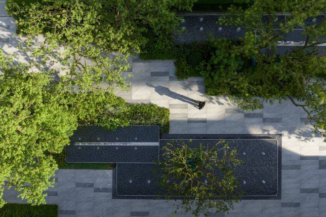 同时,社区内部景观打造了大面积的叠级水景,搭配普拉达绿大理石和浪淘沙石材,呈现整体空间的隐奢基调。