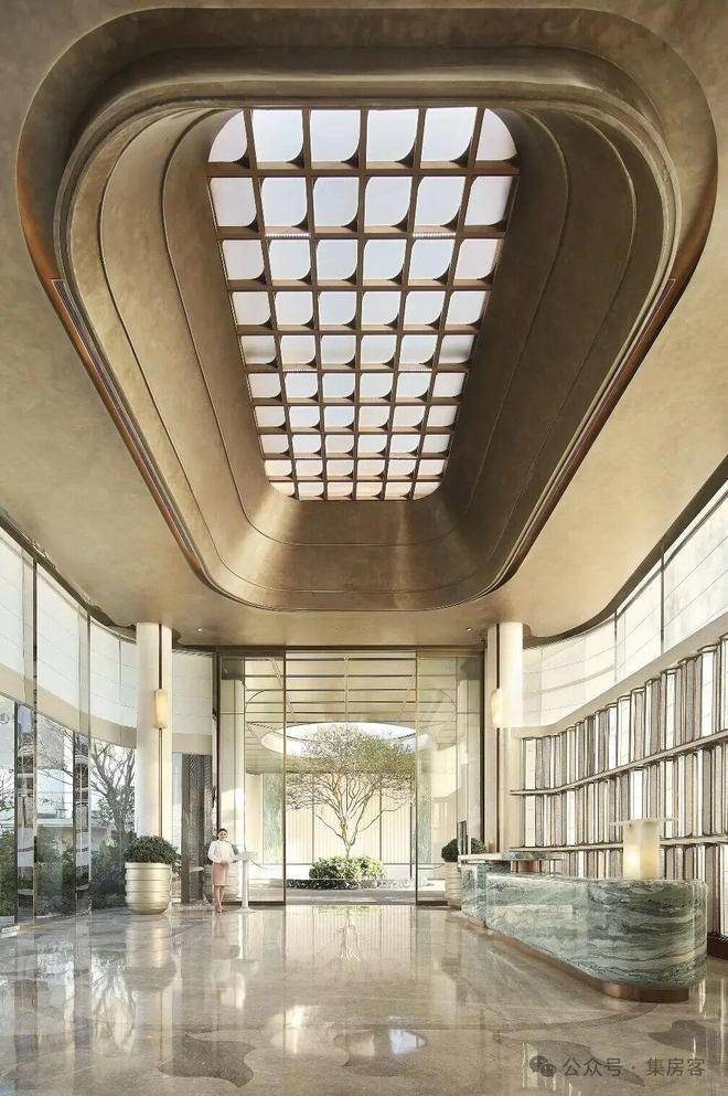 约7米高的主入口,把贝金米黄石材、维多利亚绿等名贵石材,与古铜色金属板、紫薇等名贵草木巧妙搭配、相得益彰,犹如穿着翠绿华服的翩翩公子,透着一身贵气。