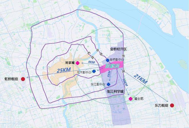 从板块区位来看,张家浜楔形绿地紧邻金桥副中心和张江城市副中心,直线距离陆家嘴约9公里,可以说是背靠着世界级的核心资源。