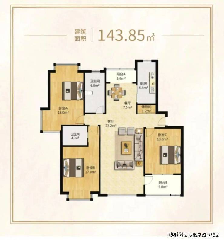 5号1202室建面约143.85m²3房,总价11223896元