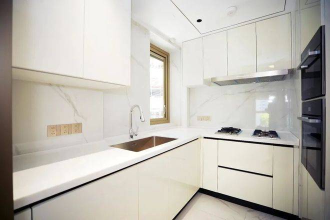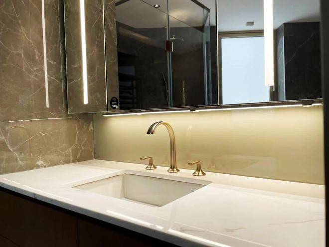 细节方面,项目采用了拉米娜的进口电视背景墙、顶级奢侈品牌卡莉斯塔的主卫龙头、ABB的智能化控制、LG的厨房台面,甚至是阳台的电动晾衣架、水槽、吊柜都是交付标准。