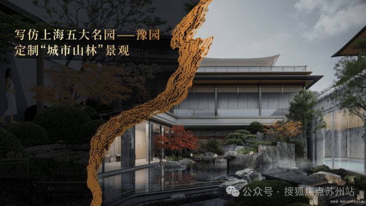 【园林】园林设计上依据“一轴两园 五进十景”规划,以豫园造景手法为基础,提取楼阁、折桥、墨池等中式元素,构建立体山水,重绘江南坊巷。