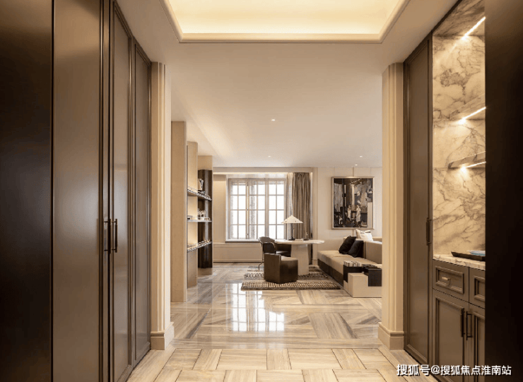 进入室内的入户玄关收纳空间,地面采用静雅棕、宝格丽兰石材拼花设计,古典回形波打+实心铜条的搭配增强入户尊贵感。右侧是山水白奢石的开放格,左侧是行李间,通过暗门的做法,将功能结合进去,强化了归家的仪式感。