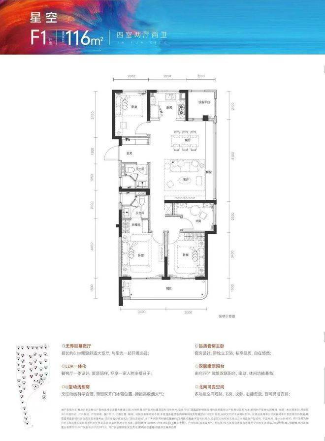 独立玄关收纳南边套房主卧带走入式衣帽间+独立卫浴+飘窗南向约6.4米面宽,带阳台,U型厨房带大开窗,餐客厅一体带约5.8米超长飘窗……该户型更具有生命力。