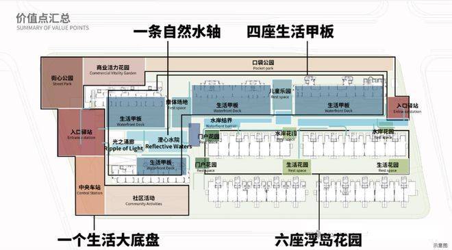 以自然水系为界,生长为独立的城市岛屿,通过六大景观节点,浮水之门、光之通廊、澄心水院、岸野森活、溪语花境、林语归岸,具象生活本应如流水般自在从容。