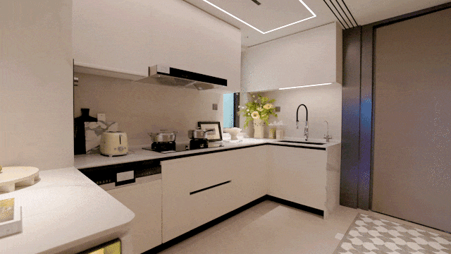厨房墙面岩板通铺,开门采用水波纹玻璃+金属造型边框的玻璃移门,顶部配置线性凉霸+LED嵌入式回形灯带+筒灯,细节考量全方位。