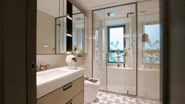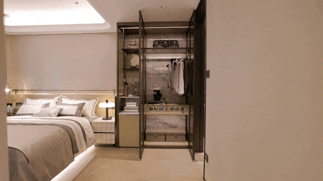 主卧套房设计,石材通铺卫生间,配备着美妆冰箱+美妆灯条+轨道收纳,还镶嵌着透光玉石,带来愉悦的审美体验。