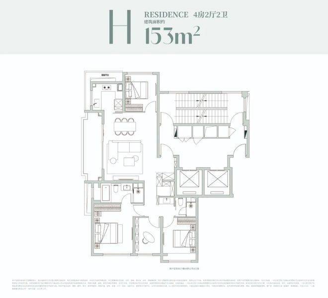 该户型是经典的四叶草布局,四开间分布在四角,兼顾私密与互动,是二胎家庭的优选;