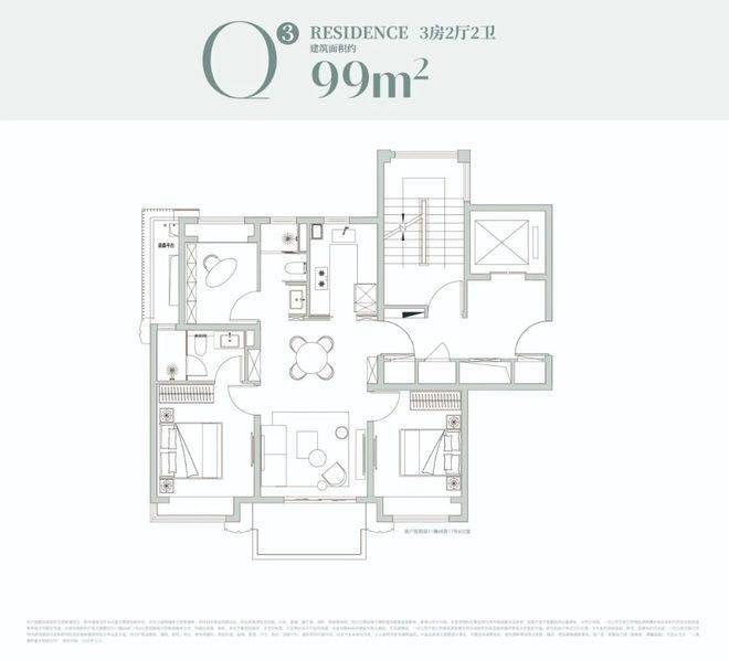 厨房、餐客厅、阳台形成直线通风廊道,南向三开间+宽尺客餐厅,轻松容纳二胎三代家庭的日常;