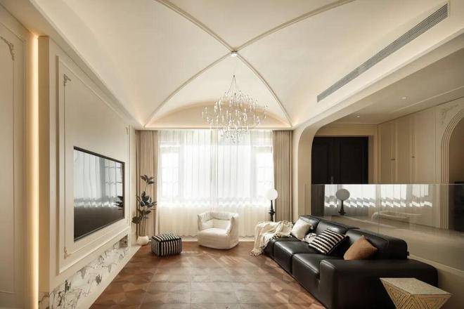 顶部采用十字拱顶+精致雕花角花设计,搭配层次分明的石膏线,复刻法式宫廷的优雅肌理,每一处线条都经过精准打磨,还原法式建筑的浪漫质感。
