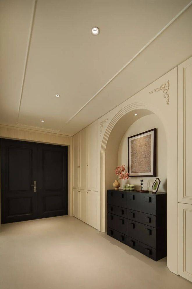 楼梯区域的黑色铁艺栏杆+弧形台阶设计,成为空间的点睛之笔,既保障安全,又延续法式的精致线条,上下楼梯的每一步,都仿佛行走在法式生活的画卷中。