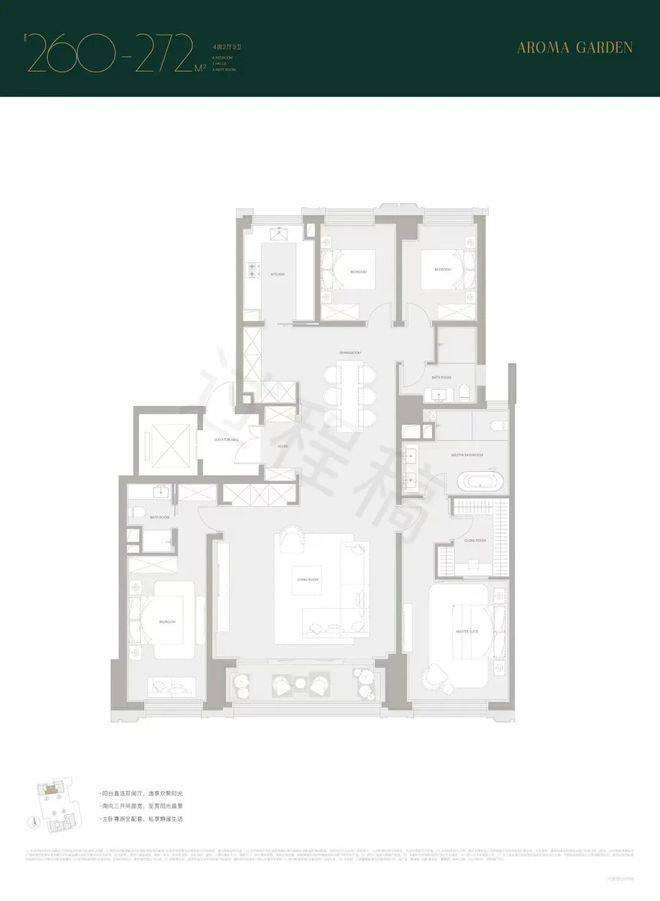 建面约260/272㎡,南向双套房,尤其主卧是豪华套房,带独立衣帽间,卫浴间含双台盆+淋浴+浴缸+马桶四件套。