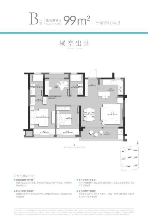总价239万元建面约99㎡装标3000元/㎡,配置包含全屋中央空调、新风系统等。小区体量不大,规划9栋高层,共918户,主力户型建面有99-121方,及少量160方顶楼房源。锦上云澜建筑外观以城市封面标准设计,配置的是双色铝板外立面,同级豪宅品质。