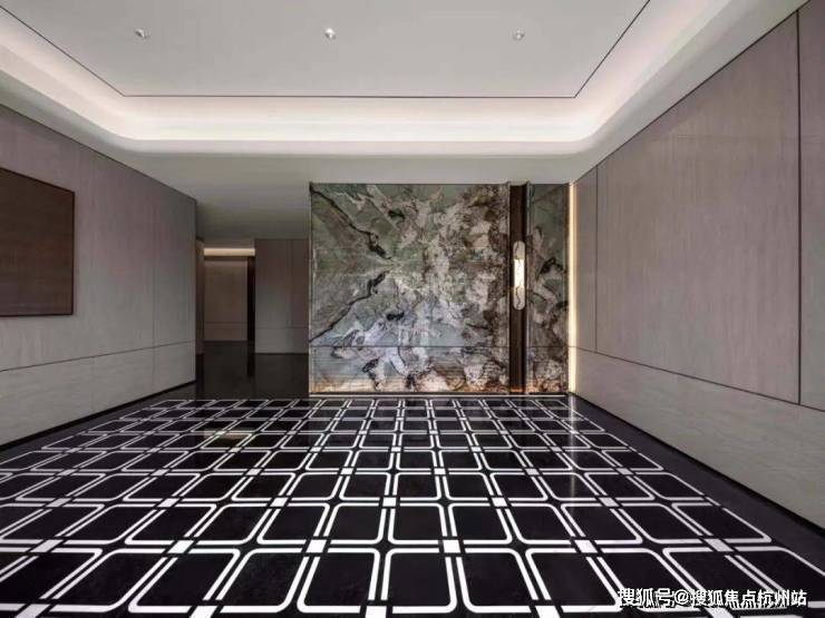 地上、地下双精装大堂 ,均按超五星级酒店标准打造。地面采用艺术 拼花石材与岩板 ,墙面饰以 宝格丽蓝岩板 ,一寸一景,奢质尽显。这已不仅是功能空间,更是一场归家的美学洗礼。