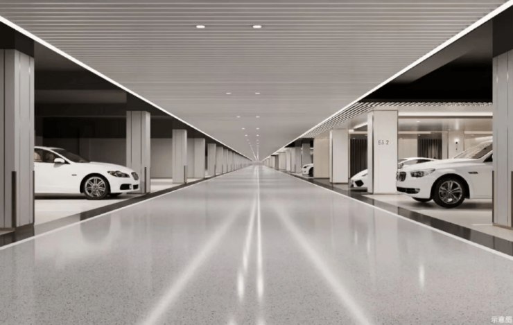 无感归家体验,地下大堂以通透玻璃幕墙、全石材铺装与自动感应门,营造高端大气氛围;精致吊顶与灯光艺术,将车行道化为艺术廊道。