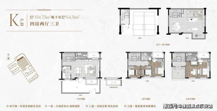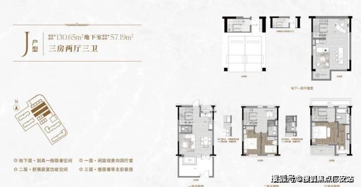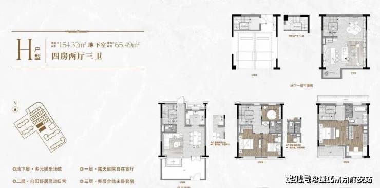 一楼和地下室主社交和志趣,二楼是子女的房间,三楼是主人休憩区。
