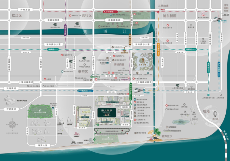 交通方面:奉贤线的性质是市域铁路,相较于地铁,车速更快、站距更大,可以助力新城快速联系市区、国际枢纽。海湾快线已通车,高效拉近海湾与南桥的时间距离;S3高速主线通车,全面对接浦东周浦康桥;市域铁路奉贤线推进,将联动机场联络线,直接换乘通达上海两大机场。