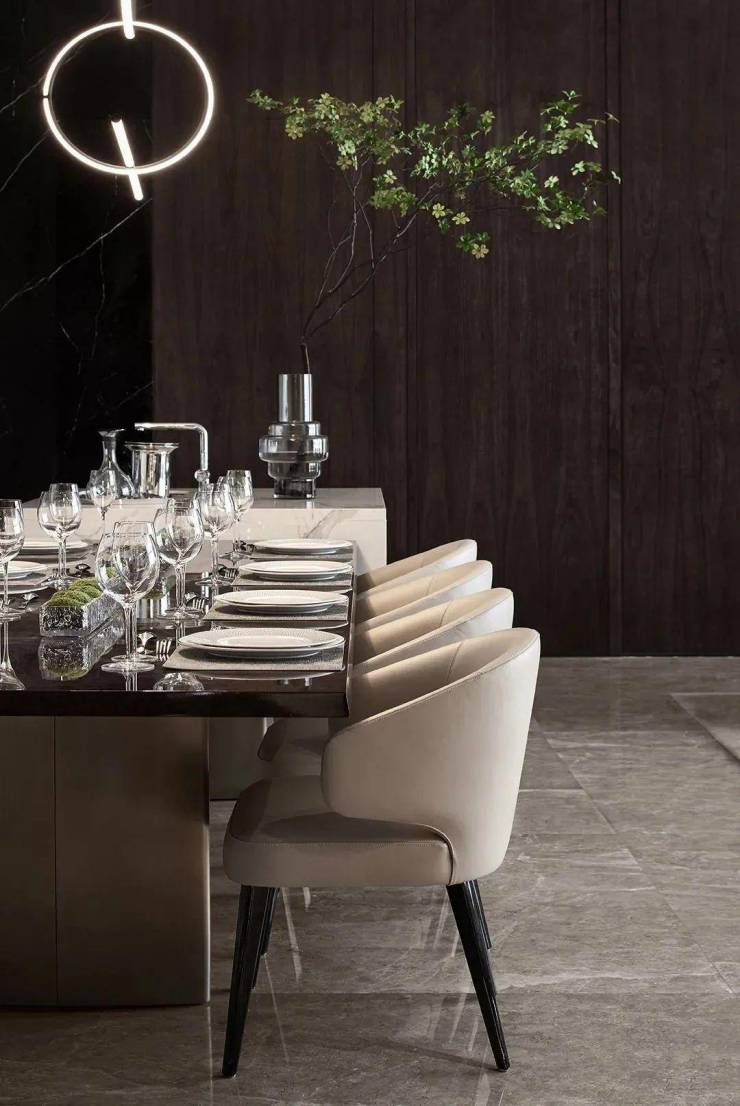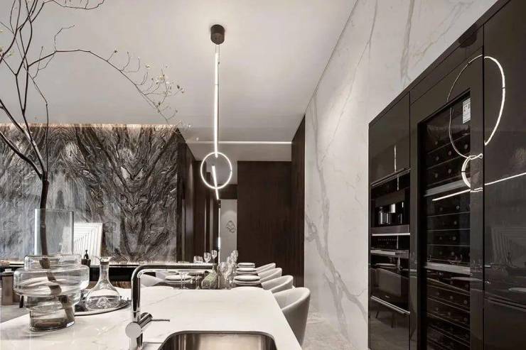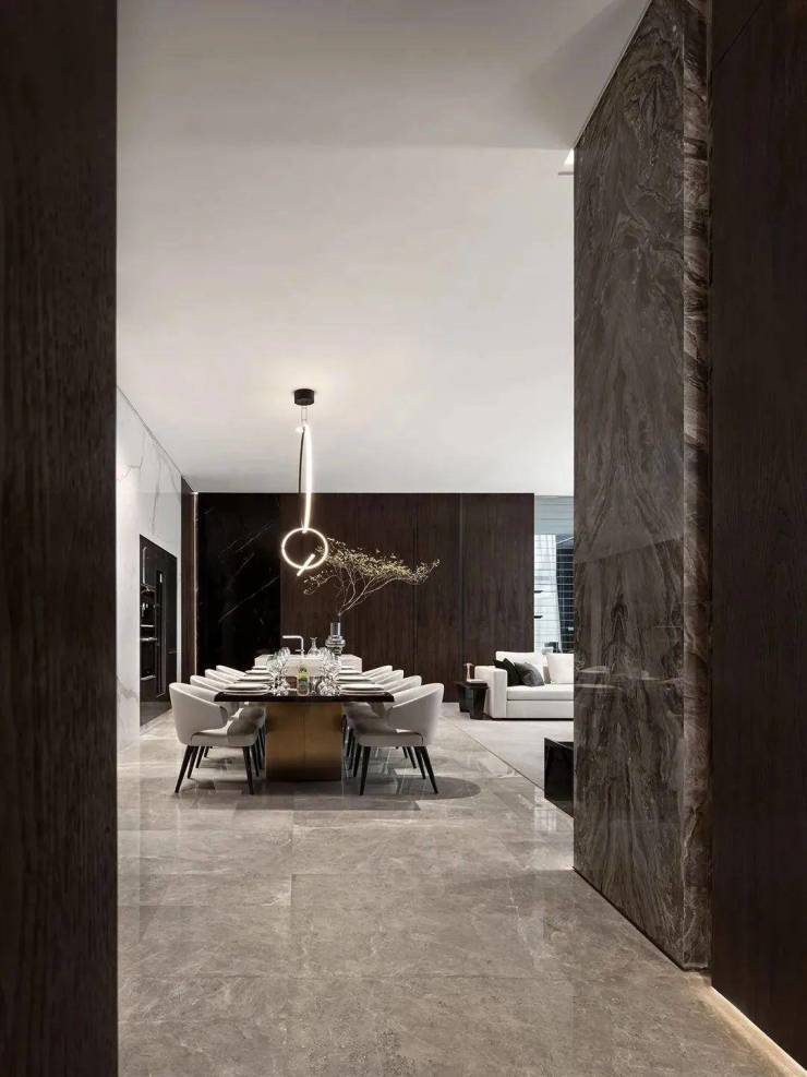 餐厅整体的设计风格和客厅的相差不大,依然以黑白为主色调,白色的大理石背景墙与客厅的背景墙相呼应,略带轻奢风的餐桌搭配绿植看上去很协调,给这个空间带来了生机。