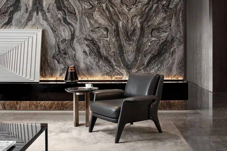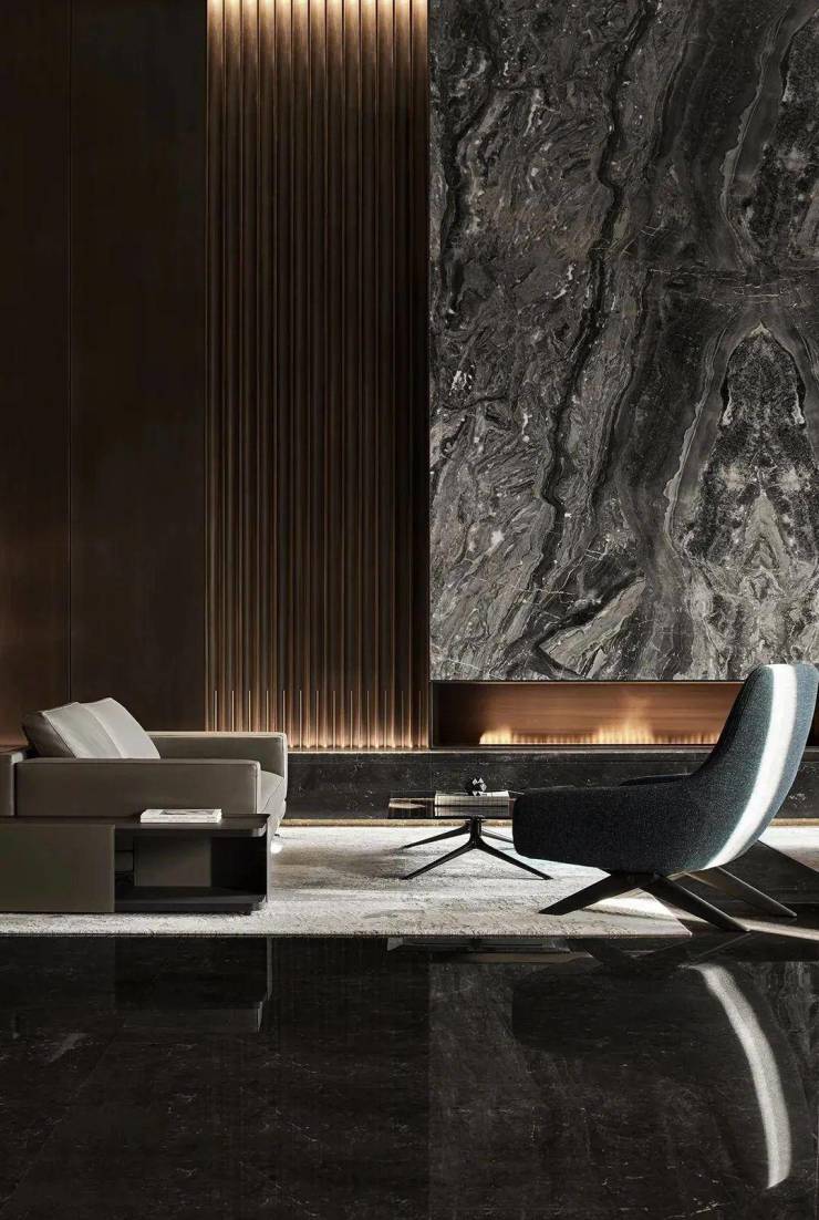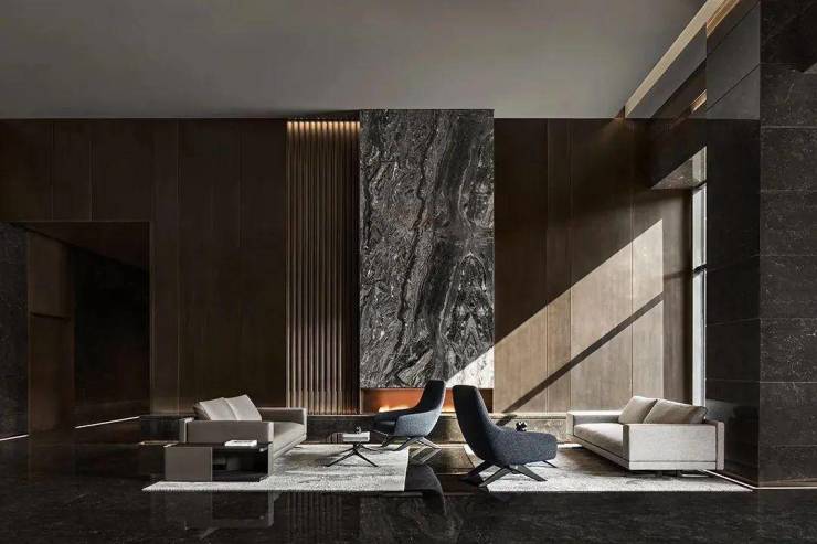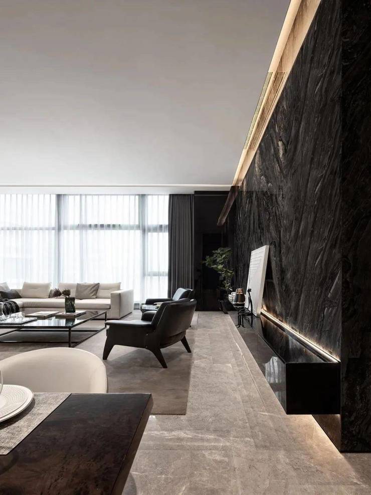客厅的色调比较鲜明,这样的色调让客厅看上去更加有质感,整面的黑色纹理大理石背景墙大气十足,落地窗带来了优质的采光,黑白家具和墙面颜色的搭配让这个空间体现出更多的质感和高级感。