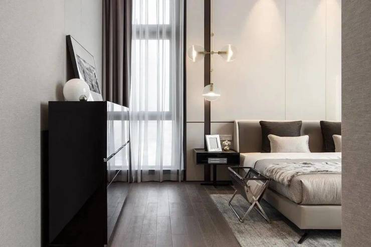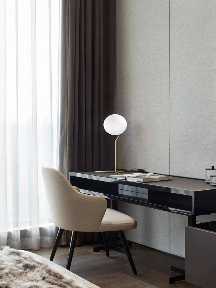 主卧空间以浅色调为主,搭配深色的窗帘让空间有了对比,从而让空间更加丰富,黑色的地板看上去更稳重,卧室空间采用落地窗来采光,空间中色彩分明,给人十分舒适的宜居感,在卧室的一侧还设置了工作区,在功能上营造了方便。