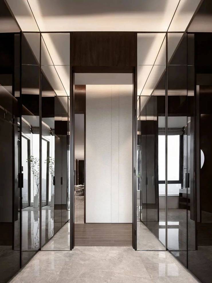 通往卫生间采用反光玻璃,让空间更加有层次,卫生间整体大理石的墙面更加大气干净,依然采用落地窗采光能带来更加舒适的沐浴体验。
