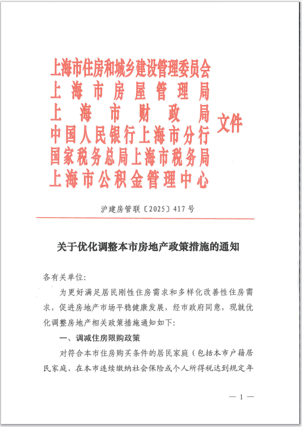 8月25日,市住房城乡建设管理委、市房屋管理局、市财政局、市税务局、人民银行上海市分行、市公积金管理中心等六部门联合印发《关于优化调整本市房地产政策措施的通知》,自2025年8月26日起施行。(政策原文见文章末尾)