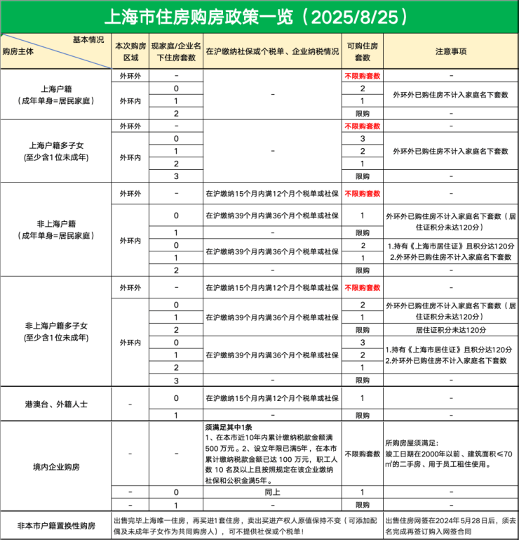 按照上述规定,沪籍居民家庭和沪籍成年单身人士,在外环外购买住房不限套数;在外环内限购2套住房。非沪籍居民家庭和非沪籍成年单身人士,自购房之日前在本市连续缴纳社会保险或个人所得税满1年及以上的,在外环外购买住房不限套数;自购房之日前在本市连续缴纳社会保险或个人所得税满3年及以上的,在外环内限购1套住房。