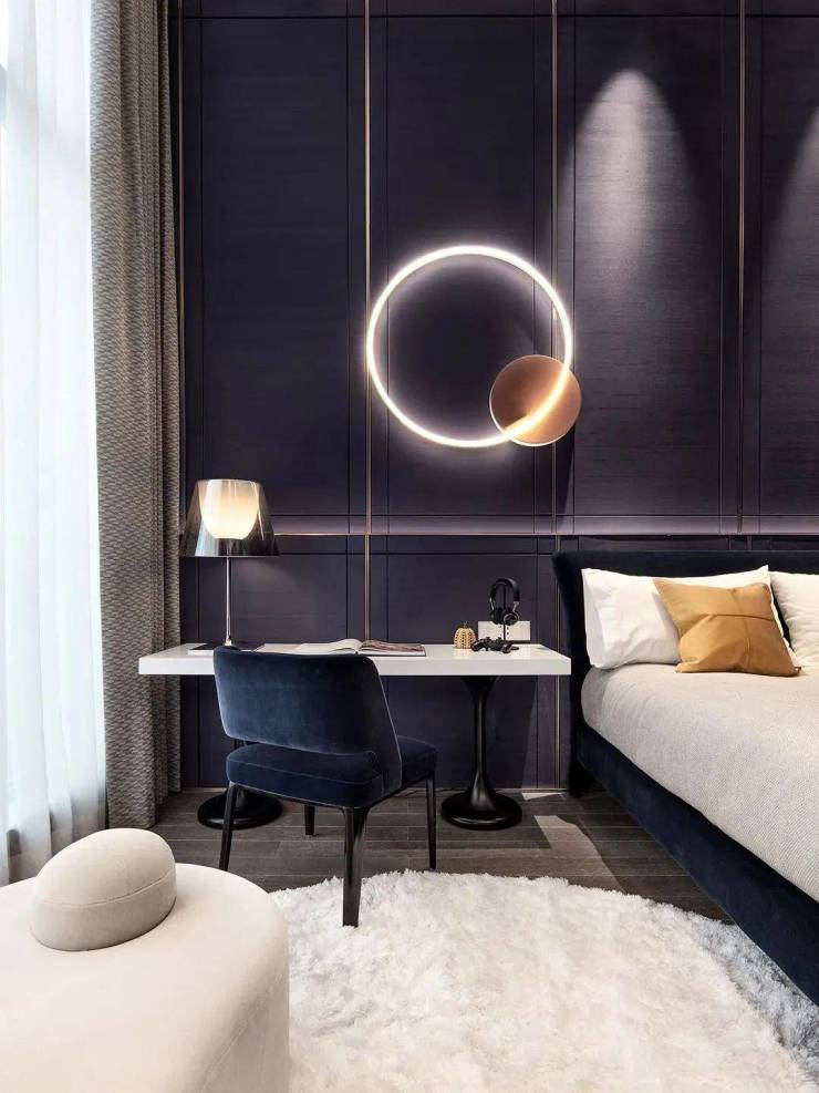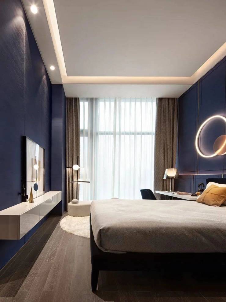 次卧采用蓝色背景墙,跳色的运用使得这个空间更加丰富,这个空间的灯光和各种摆件的运用都很精致,营造出了十足的舒适感。