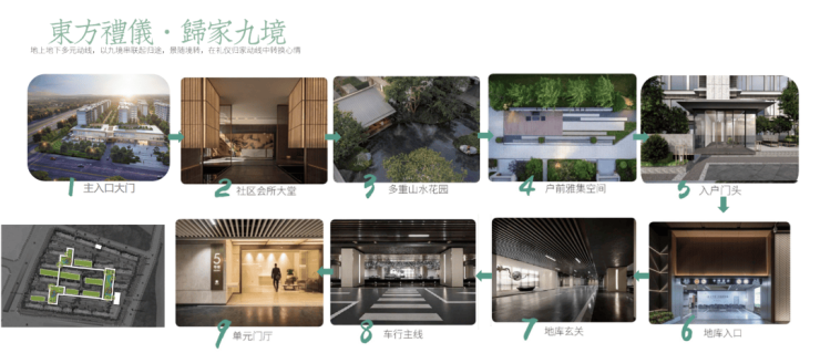 🔅九重归家动线:社区入口双层酒店式形象门楼——(地上归家)社区会所大堂、多重山水花园、楼前雅集空间、单元大堂 ——(地下归家)地库出入口、地库玄关、车行主线、地下层单元大堂