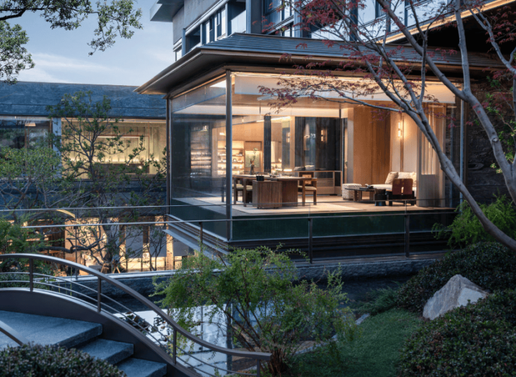 再往里走就是近460㎡的下沉式庭院,精选太行山金景石堆叠成小山丘,引进溪水汇聚成池塘,并移栽岭南珍贵的古桩铁冬青和中华原生乌桕树,形成一幅立体山水画卷。