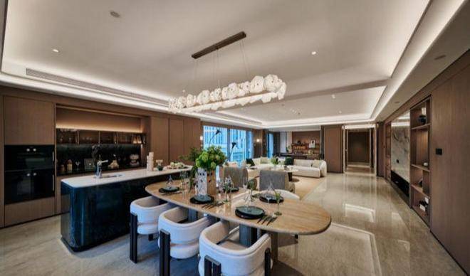 餐客厅的尺度达到了约80-90m²,拓展可达约100㎡,视觉震撼度拉满,采光优越,让空间显得非常阔绰。精装更是重金打造,
