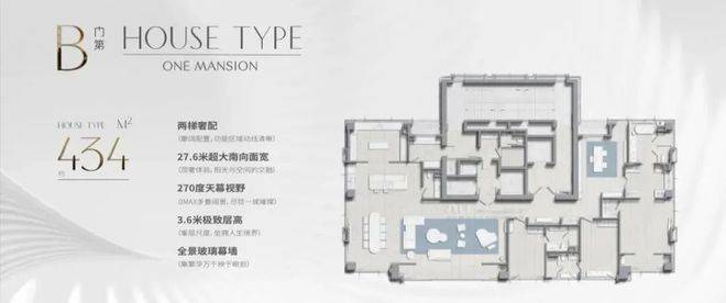 主力户型:434㎡四房三厅五卫(两梯一户)、579㎡五房四厅六卫(三梯一户)。