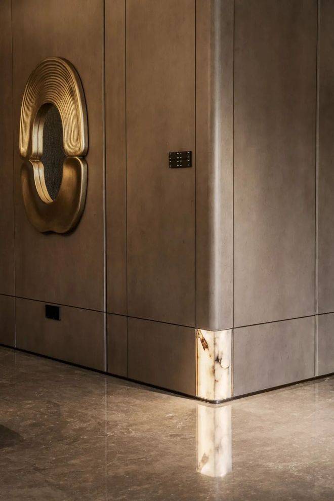 通过玄关进入客厅,可以发现在客厅局部转角的墙面增加了透光石材地脚,在这种细致又高颜值的设计上,看到了质感空间的自我修养。