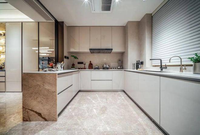厨房也是重头戏。开间达到3.8米,U字形操作面、冰藏区、洗涤区、多功能储物区、小家电区以及西厨岛台区等,动线合理,一气呵成。
