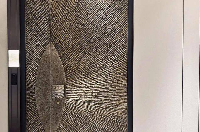 从电梯出来,就能看到来自意大利的博邦装甲门,与意大利米兰银行金库大门相同品牌,外层选用原生黄铜,通过全手工锻打工艺打造而成,质感爆棚。