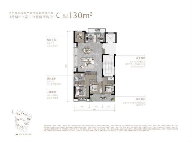 • 尊崇主卧:套房式主卧设计,自带L型衣帽间,独立卫浴