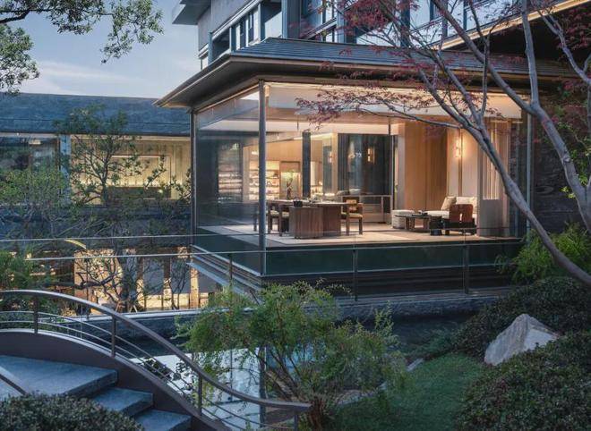 恒温泳池:采用全景落地玻璃墙,巧妙消融了室内与自然的界限。畅游其间,庭院山石如天然屏风倒映眼前,仿佛在自然山水间徜徉。