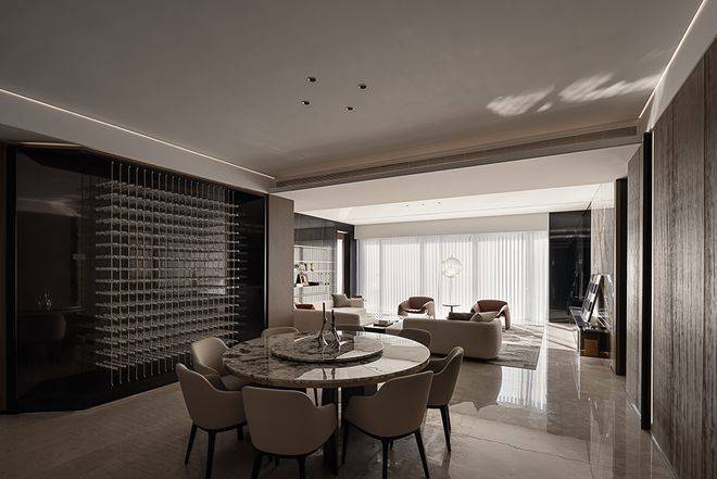 空间在材质搭配上,也是极尽雅奢可能。鱼肚白岩板打造的大岛台,营造温情的社交一隅;木饰面与金属软硬质感的碰撞,有序的墙面分割把握了整体空间的节奏感;双背景墙分别由鱼肚金岩板和劳伦黑金色系展墙组成彰显奢华。