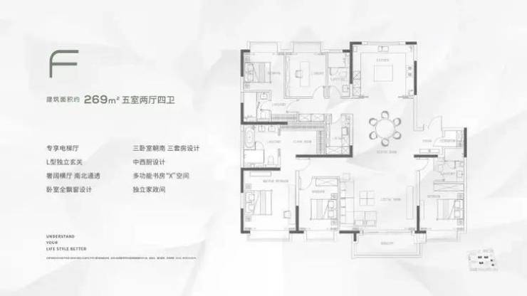 主力面积约190㎡/229㎡/253㎡/269㎡/330㎡4-5房,主力户型3.3-3.5米层高,私享“独立电梯厅”设计、精工品质与国际一线品牌精装、四重精装大堂等产品设计,是上海品质住宅天花板。
