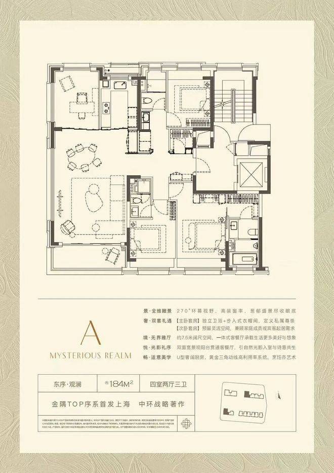 184㎡户型将空间感做到极致,约7.5米超大面宽客厅,带来270°环幕视野,绿地景观一览无余。双卧室套房设计,照顾了家庭成员的隐私性诉求。