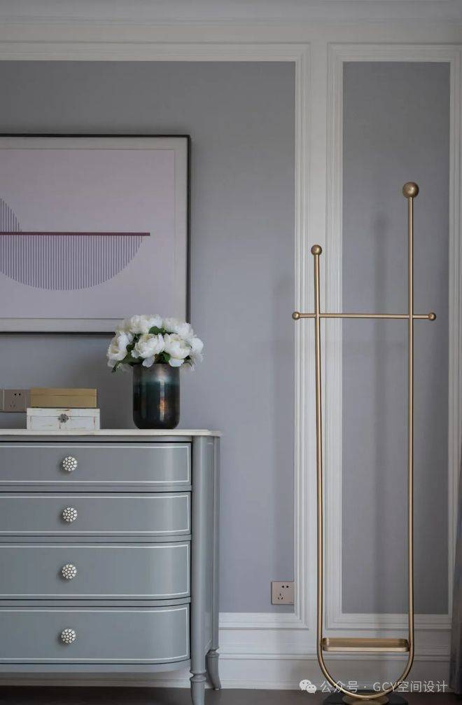 白色混油边框线与蓝浅灰色调墙面结合,营造出优雅且富有层次的空间氛围,是法式风格中塑造层次及精致感的典型手法。蓝灰色斗柜采用弧形轮廓与精致的镶钻拉手,兼具收纳与装饰功能;金色金属衣架的几何造型,以轻奢质感强化了空间的艺术氛围。