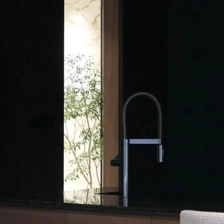 而门口的墙面,更是用大理石与绿植山石装裱出一幅立体的山水画,在垂直立面上演绎“石中有画,画中有境”的宋式空间美学。为了契合宋代织锦的“天华纹”,泳池对景墙独创了“琉璃錾铜·经纬叠映”的构造,以铜为骨,内嵌玻璃砖墙,用琉璃构建出特殊的“经纬提花”.