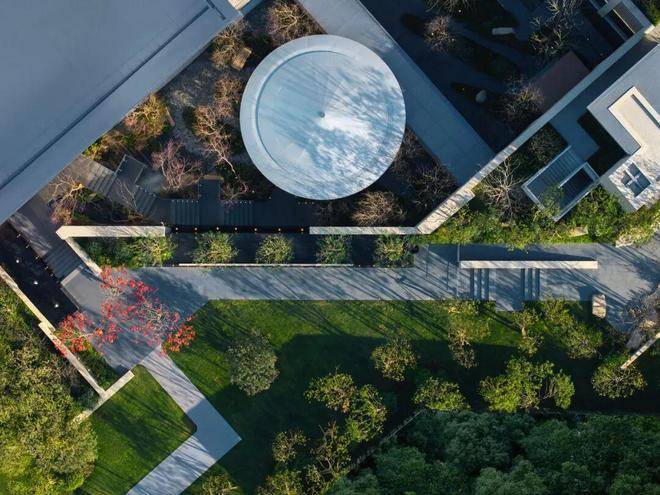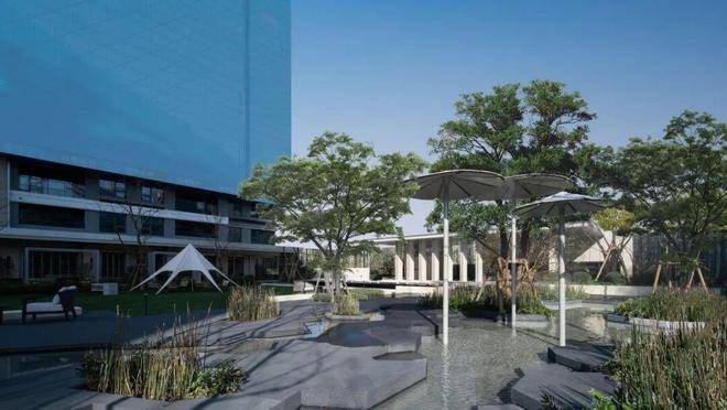 步入社区,首入眼帘的是6米高水幕的下沉式山水庭院,与周围建筑融为一体,将自然与松弛感带给社区。