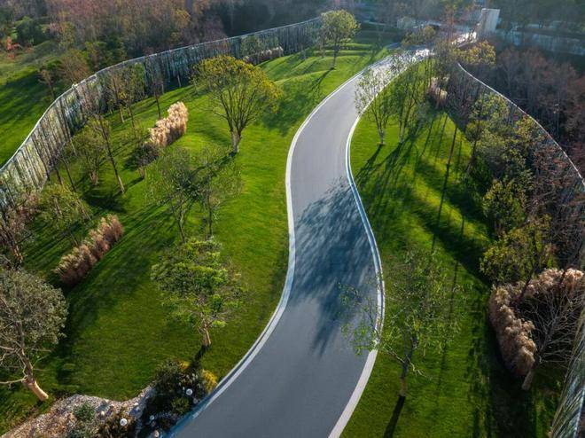 不同于传统示范区,项目结合外部约6万方的公园,将社区嵌入公园内,踏进四季隐秀的场域,映入眼帘的是蜿蜒曲折的公园。