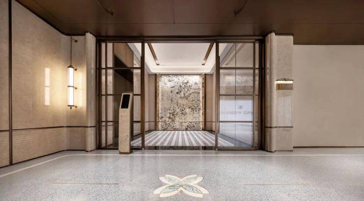 地下光厅同样采用了海派轻奢风格打造,金属背景墙、岩板墙面、水磨石地面及铝板+发光云石吊顶,营造出酒店式归家感。